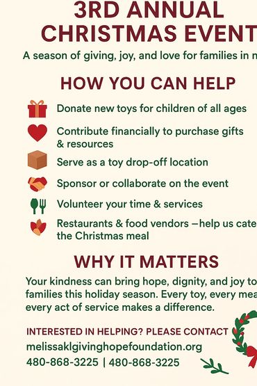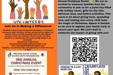 We are a nonprofit organization dedicated to serving the needs of our local community. From providing food and shelter to those in need to offering educational programs and support services, we are committed to making a positive impact on the lives of those around us. By supporting Melissa KL Giving Hope Foundation, you are supporting your community and helping to build a brighter future for all.